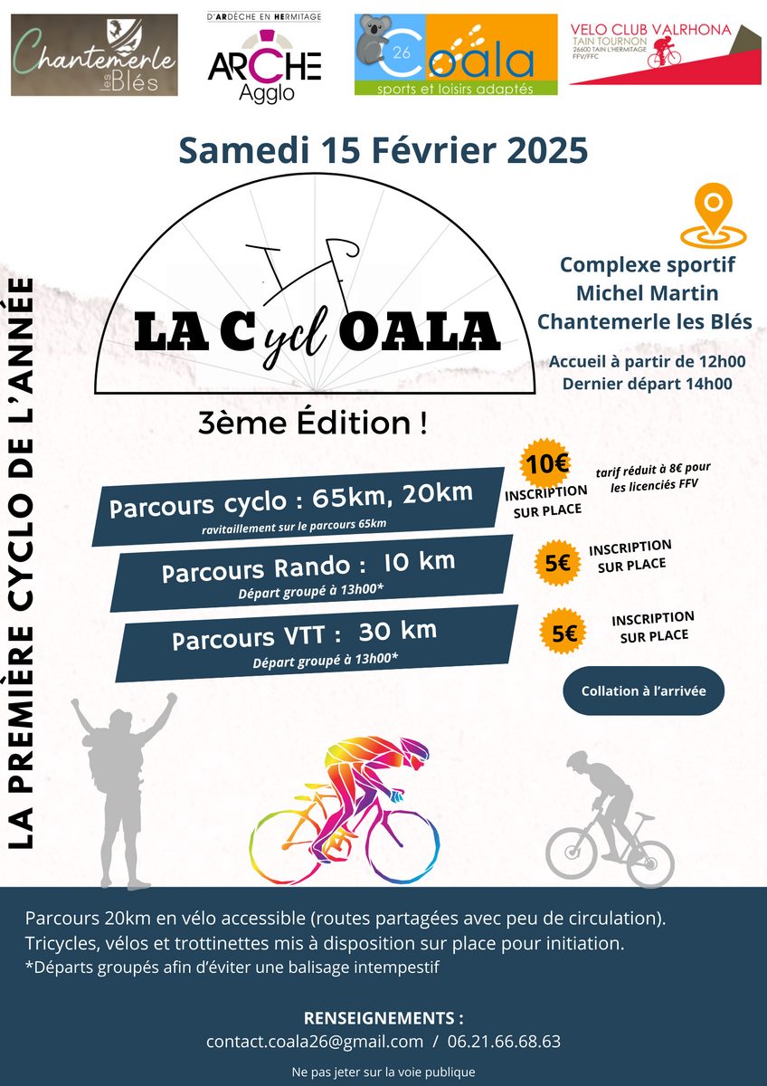 Après 2 premières éditions réussies, COALA et le Cyclo Club Valrhona vous proposent de nouveau la première cyclo de la saison le Samedi 15 Février 2025. La date est légèrement avancée par rapport aux années précédentes car les Boucles Drôme Ardèche classic auront lieu le 1er week end de Mars.