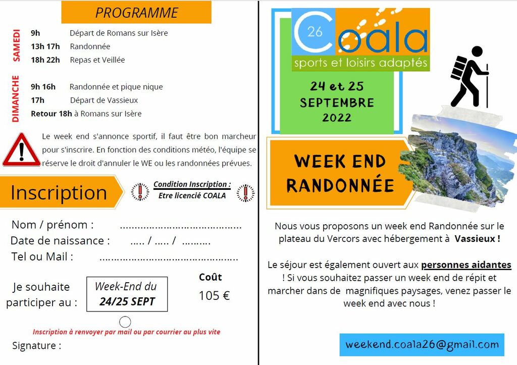Toutes les informations sont notées sur le document ci joint pour l'inscription !Le week end est également ouvert aux personnes aidantes. Un temps de répit pour respirer l'air frais de la Montagne ! Pour les aidants, contacter nous directement sur weekend.coala26@gmail.com