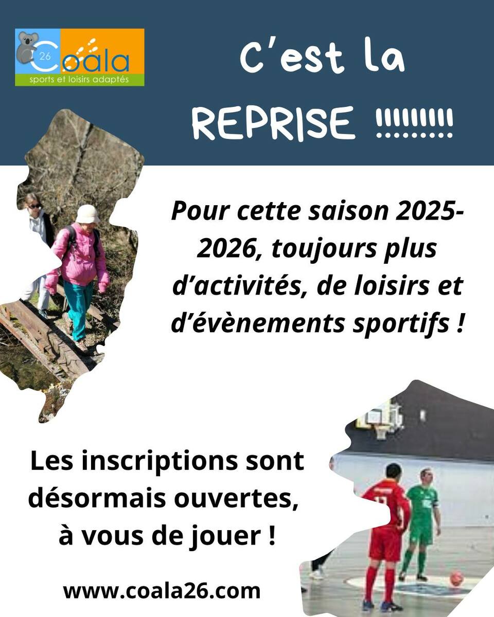 On se retrouve pour une nouvelle saison avec au programme du sport, du sport et.... des surprises ! Les inscriptions sont désormais ouvertes, vous pouvez vous inscrire en ligne directement sur notre site www.coala26.com ou télécharger le dossier d'inscription que vous trouverez sur notre site, rubrique "documents". On vous attend nombreux. A vous de jouer