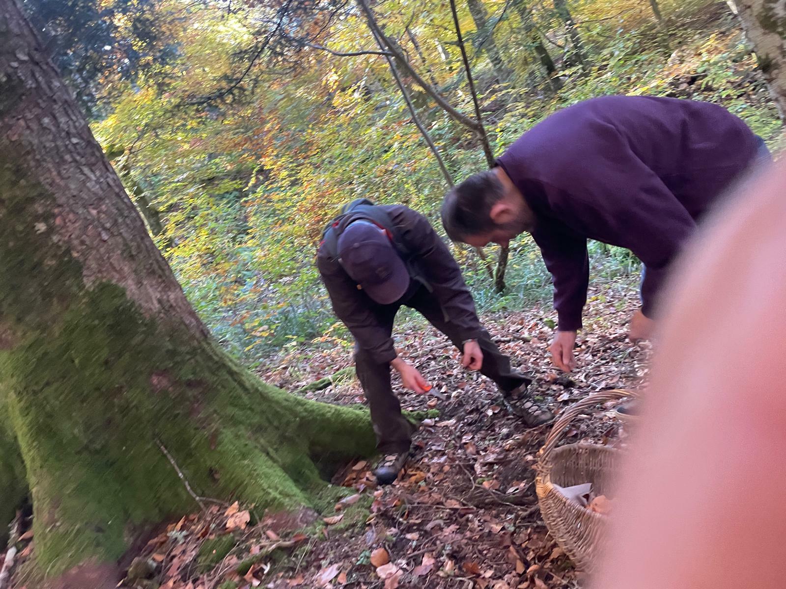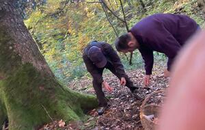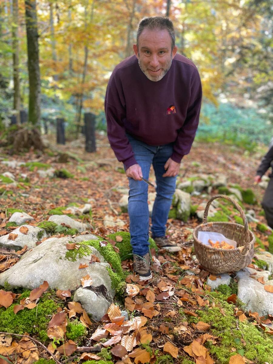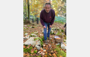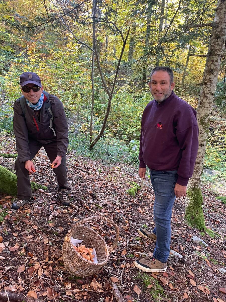 2 Semaines plus tard, nous revoilà au chalet de Lente pour un nouveau week end. Le samedi 18 est doux et beau, le soleil emmène des couleurs magnifiques dans les arbres et leurs feuilles automnales. Nous en profitons pour faire un premier tour rapide le matin près du chalet pour voir où en sont les champignons. Les sanguins sont toujours bien présent mais rien de plus ! L'après midi, nous repartons un peu plus loin, d'abord pour voir la grotte du Brudour, puis pour rentrer jusqu'au gite à pied pour un groupe et repartir en ceuillette pour l'autre. Au final se sont de beaux paniers qui sont ramassés pour l'omelette du soir ! Celle ci préparée par Lionel rassasie tout le monde.